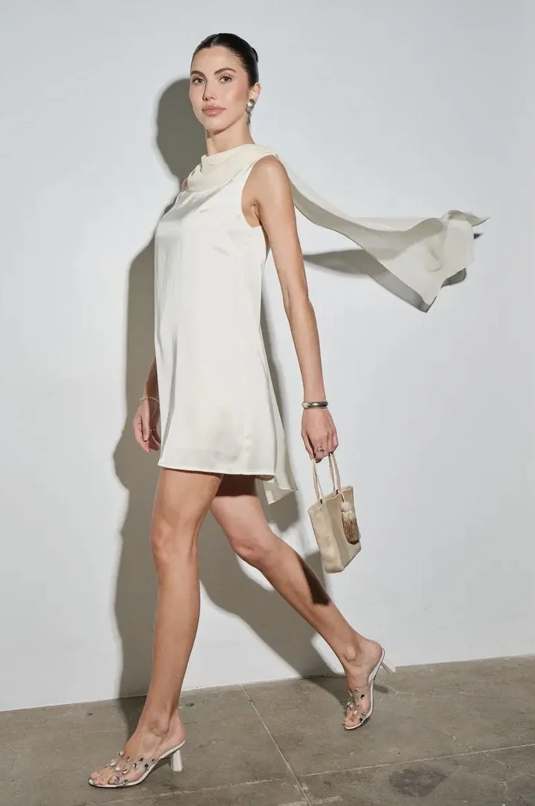 dress features a fluid satin in a lightweight, liquid-smooth hand that catches light with a subtle sheen. A softly draped cowl neckline gathers at one shoulder, flowing into a relaxed shift silhouette at mini length an elongated back drape panel adds effortless movement. Pairs cleanly with strappy heels or low mules for event-ready styling.